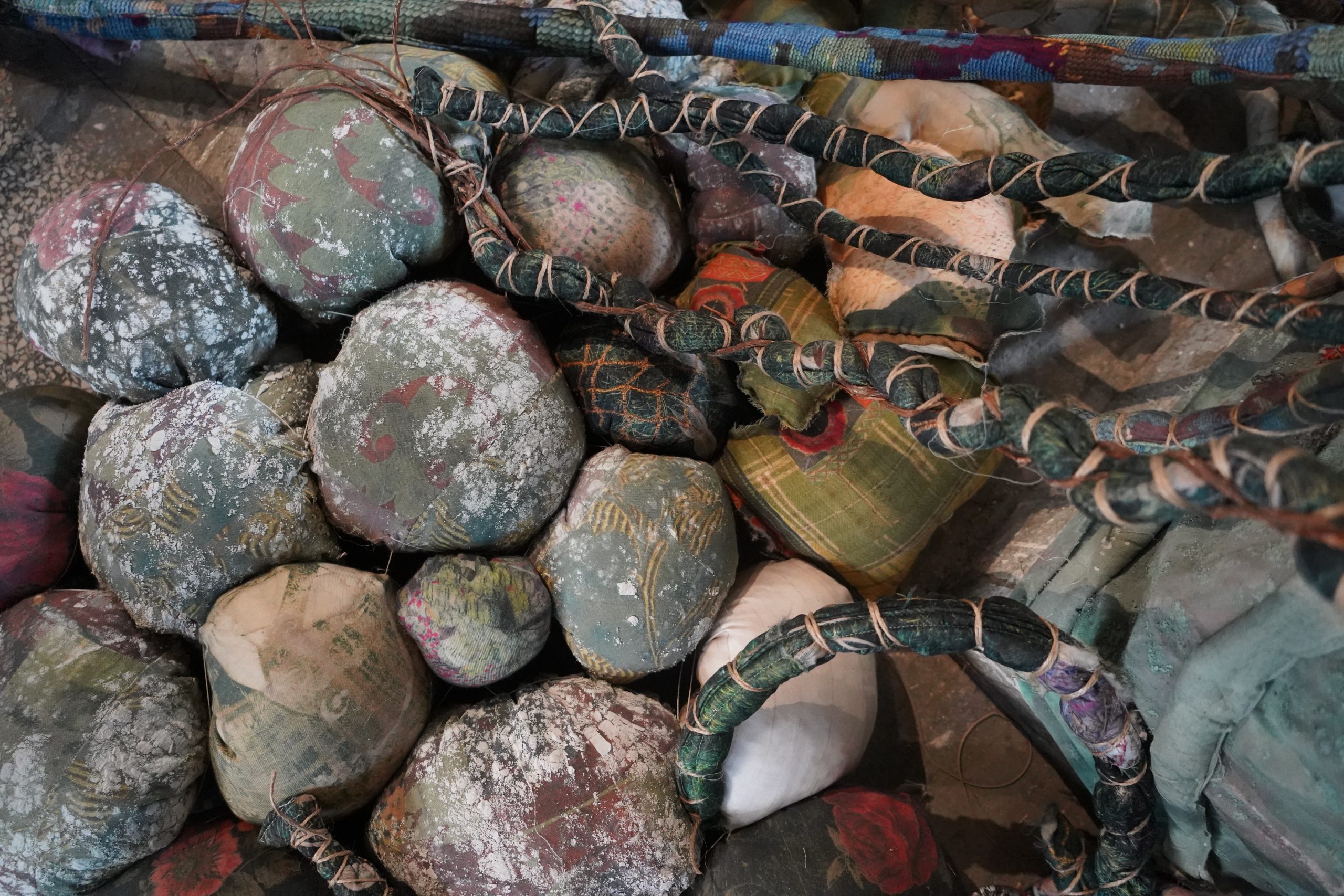 At its heart stands a breathing body, wrapped in different fabrics, threads, and textures overlap; dyed, stitched, torn or repaired, revealing time, memory, and transformation. Here fabric becomes a vessel for memory, gesture, and exchange.